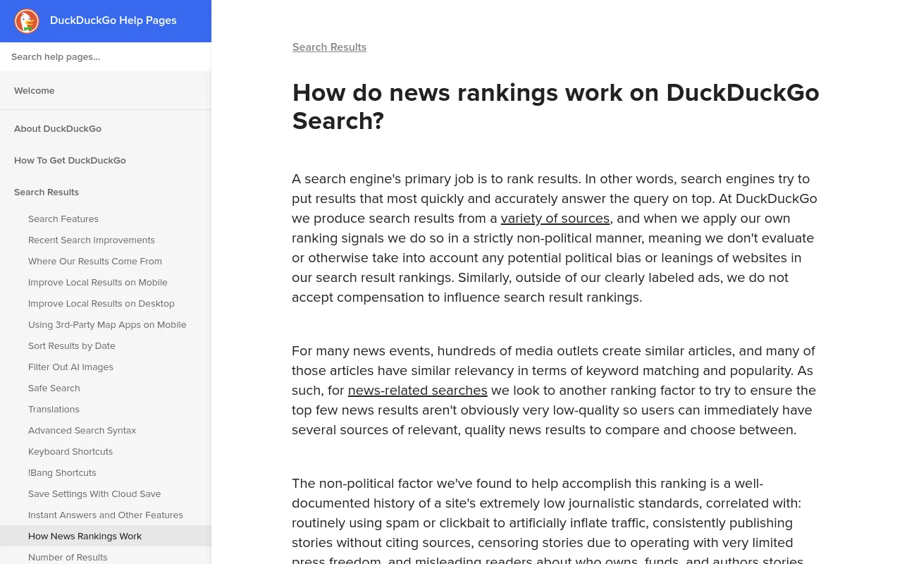 See DuckDuckGo’s explanation of how it ranks news and other results for additional context.