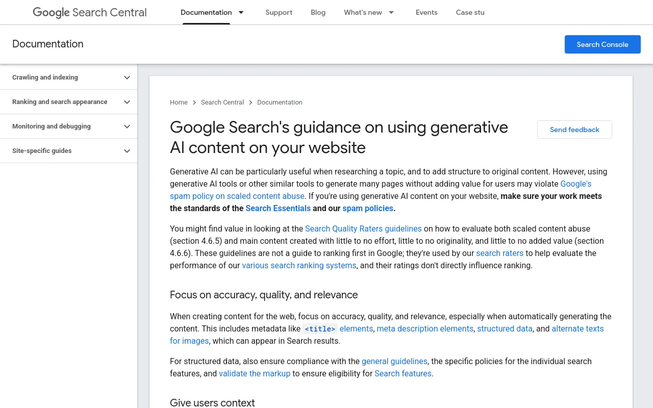 On the one hand, Google’s official stance on AI is surprisingly permissive. Search Central makes it clear that helpful content can be created with or without automation, and that AI assistance itself is not against the rules. The real problem is using automation primarily to manipulate ranking or flood the index with thin, repetitive pages.